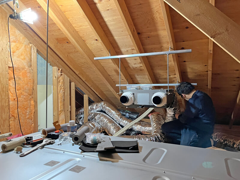 全館空調の設置工事から試験運転までの流れは、「全館空調の工事の流れ」でご覧いただけます。 全館空調を設置する環境や状況に応じて、作業の流れは変動いたしますので、予めご了承ください。
